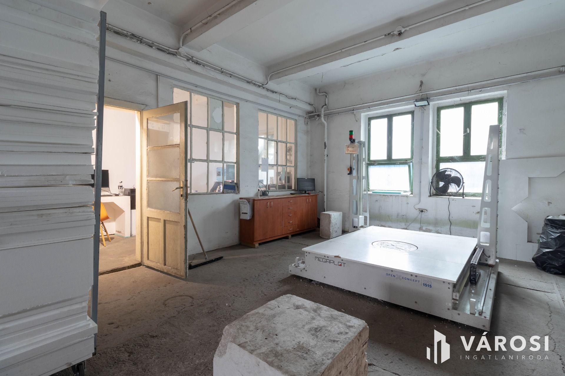 FÖLDSZINT: 1767 m2, melyből 1290 m2 óriási csarnoktér. Az aszfaltozott csarnokban a falak melletti 9 méteres belmagasság és 14 méteres teljes belmagasság magas állványrendszerek vagy nagy gépsorok elhelyezésére is gond nélkül alkalmas.
