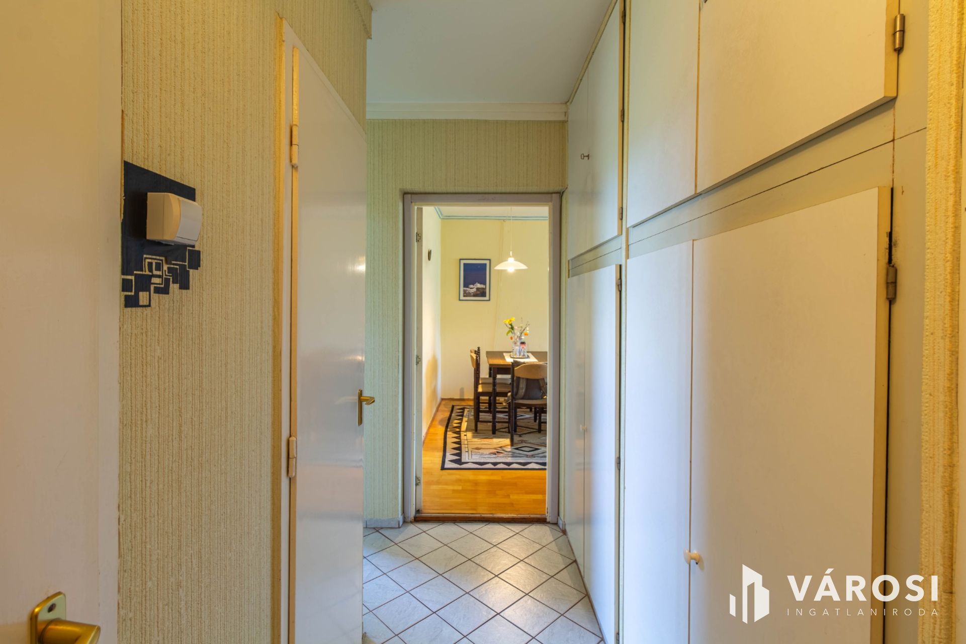 A lakás egyik különlegessége, hogy a hall-ot képző fal nem került beépítésre, így egy tágas, nagy, igencsak napfényes nappalit kapunk, ahol kényelmesen elfér az étkező is. A folyosón beépített szekrény került kialakításra.