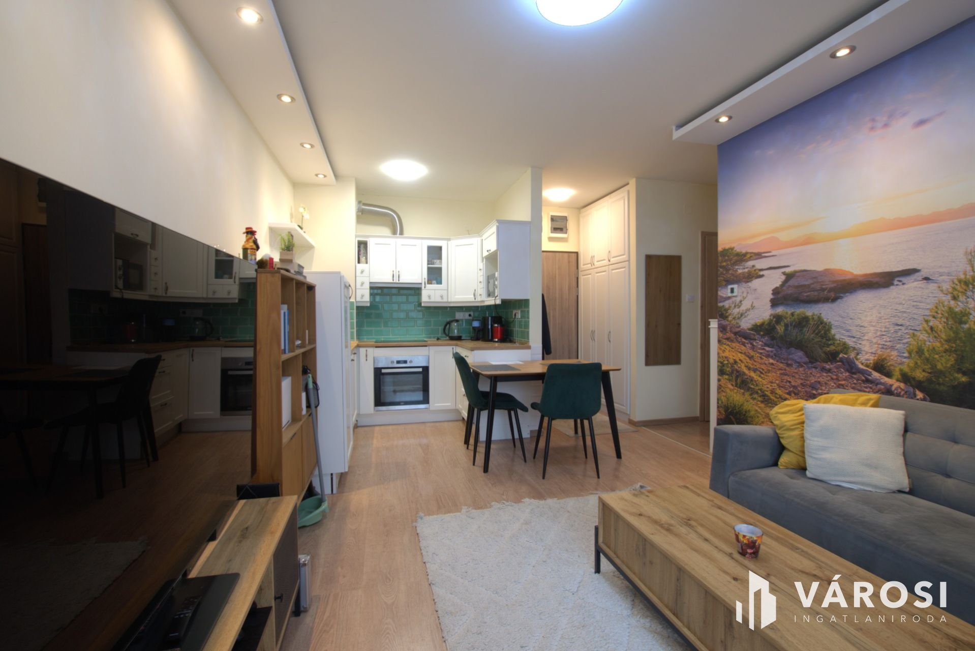 A lakberendező által tervezett belső tér egyszerre letisztult és praktikus: amerikai konyhás nappali + háló, külön fürdő és külön WC, valamint beépített gardrób. A konyha teljesen gépesített, és a vételárban benne van több extra is (AEG mosógép, Klarstein szárítógép, elektromos redőnyök, szúnyogháló, hangulatvilágítás).