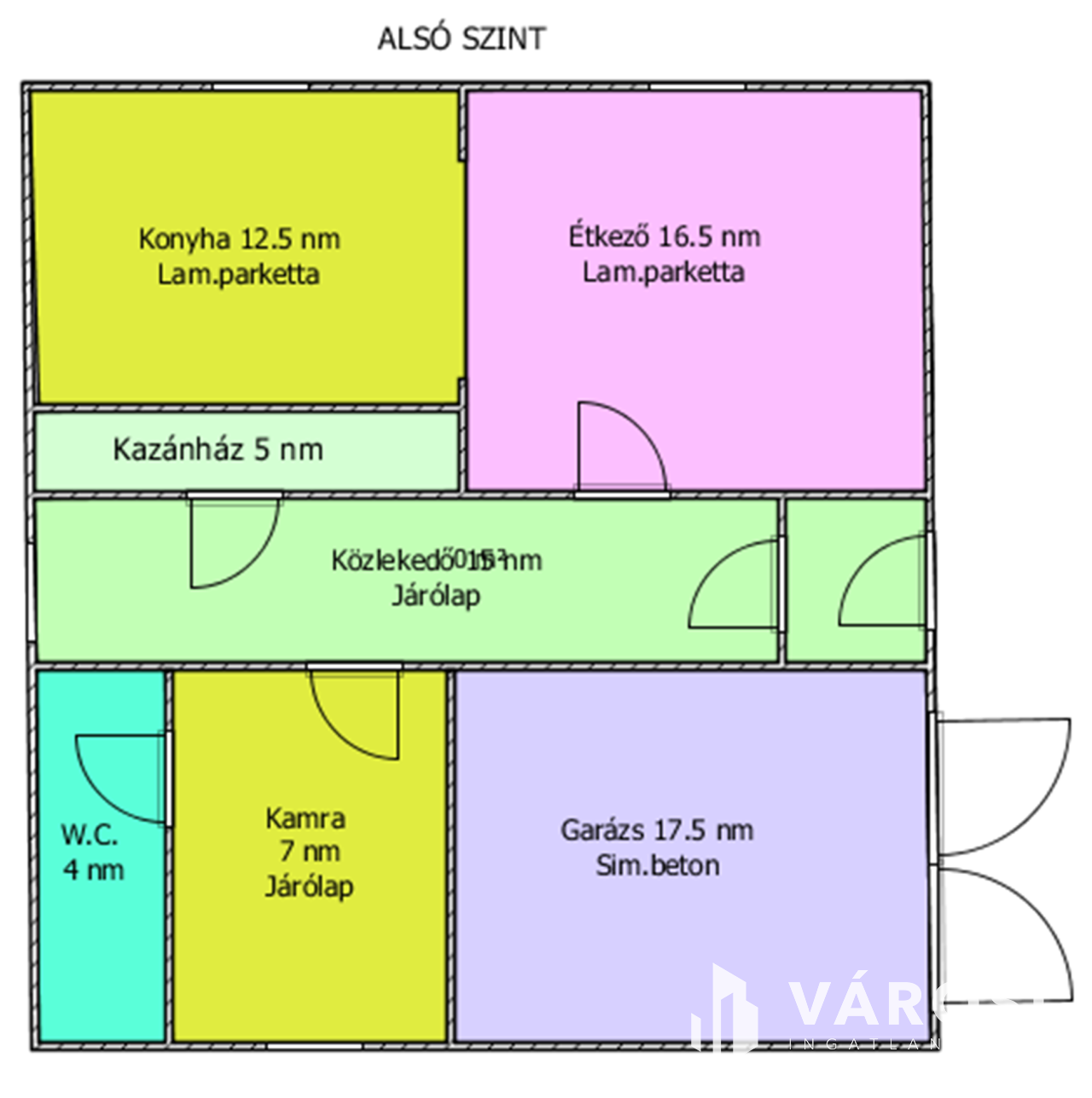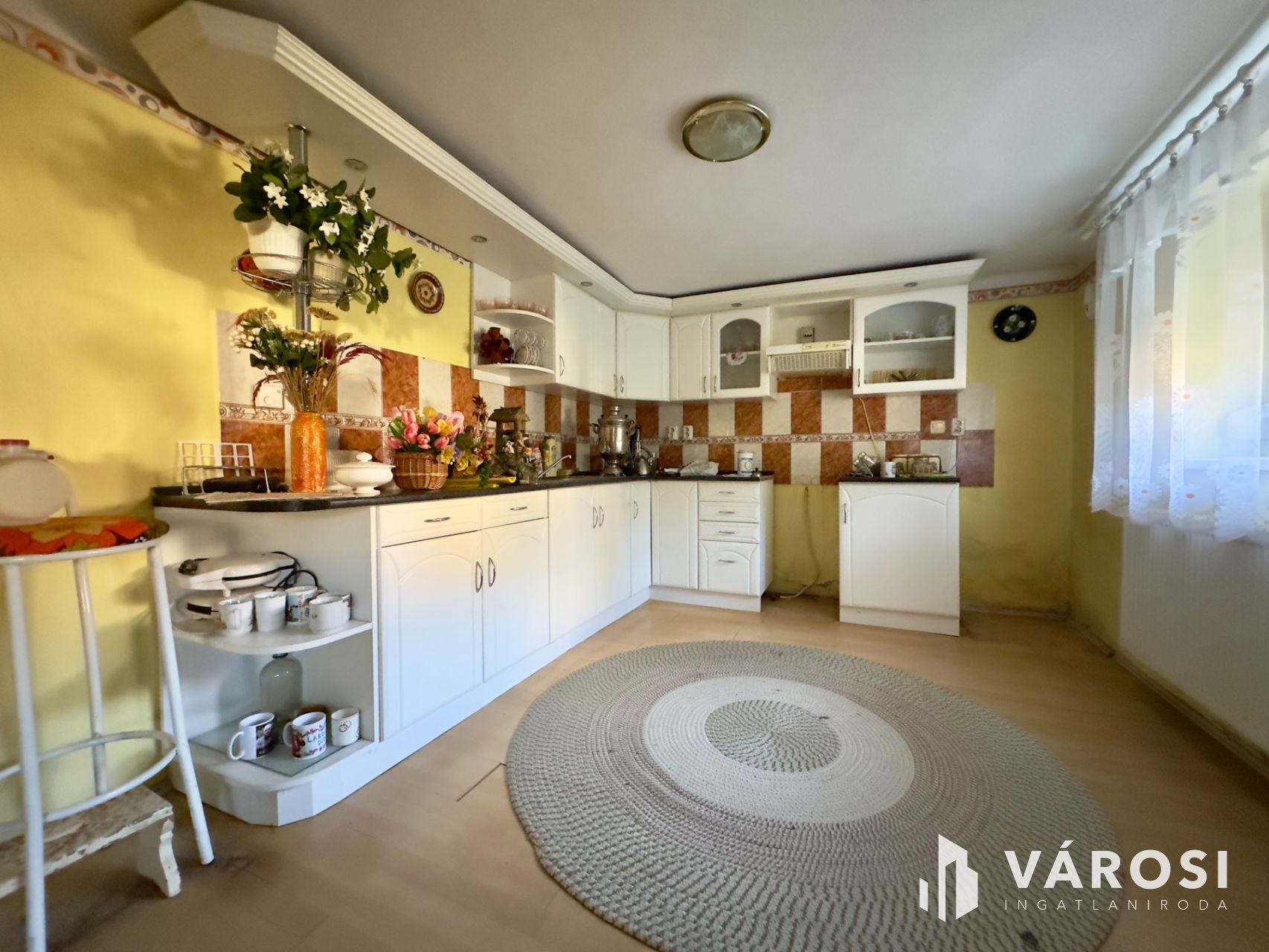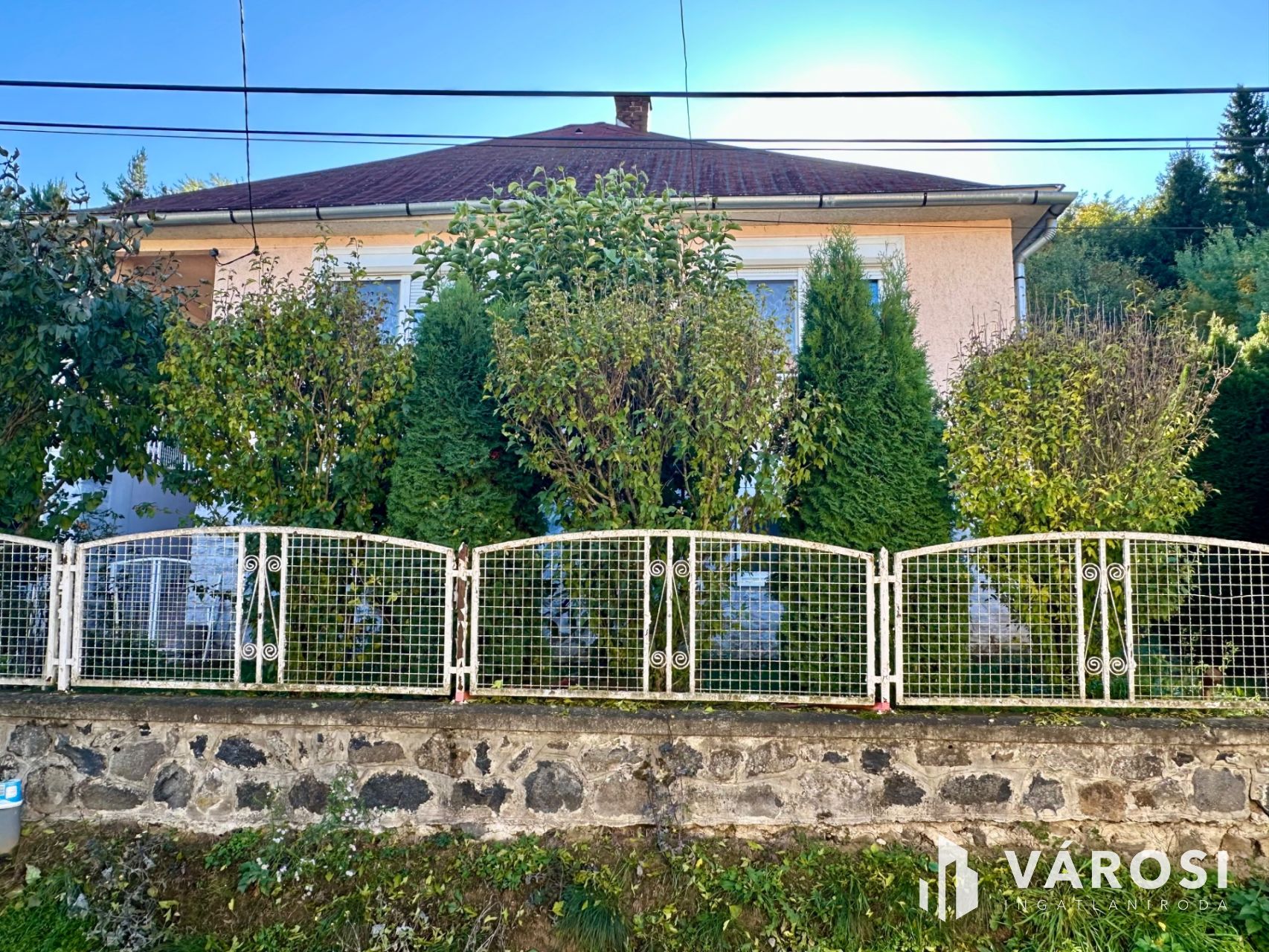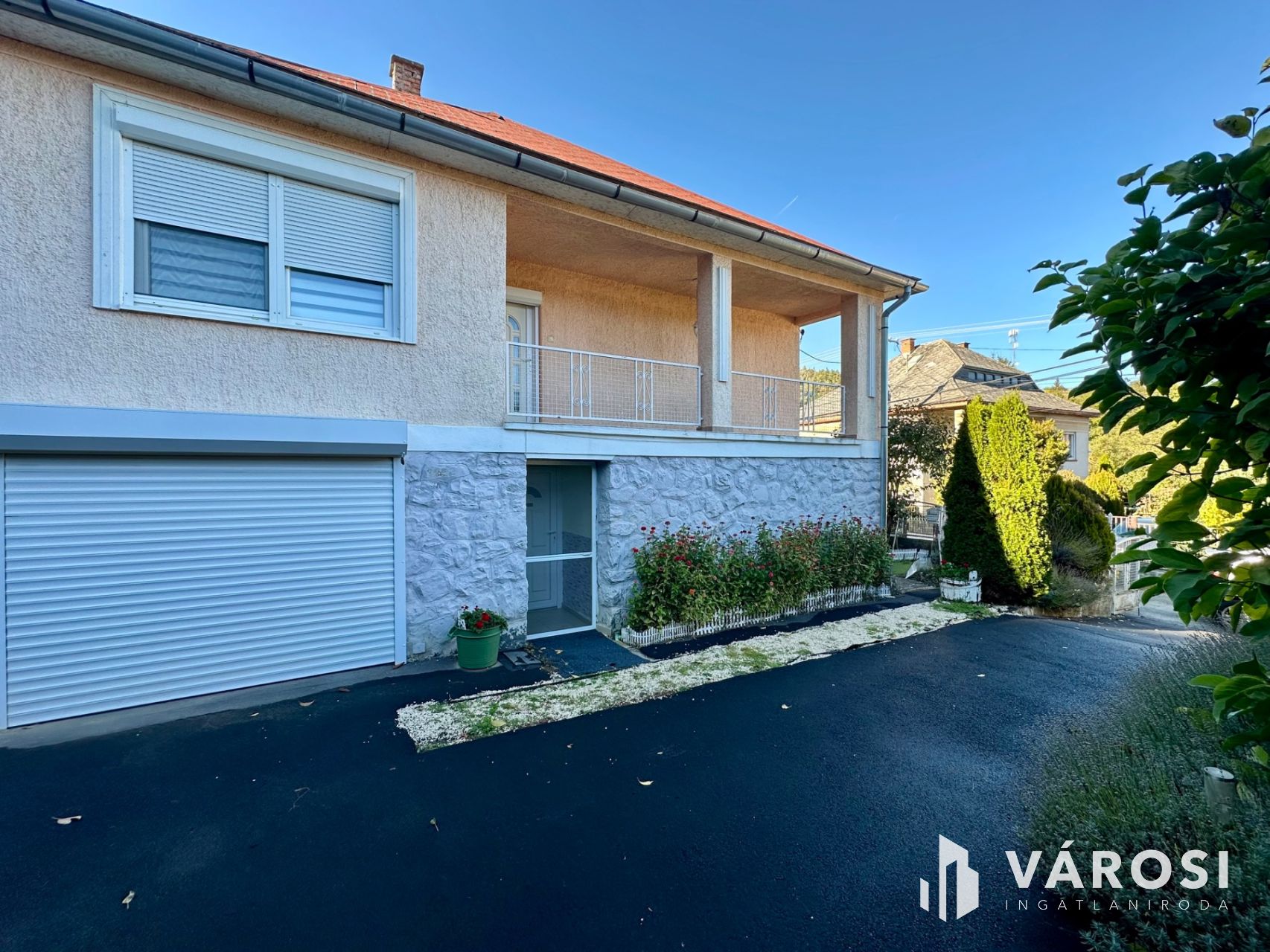 Helyiségei: az alsó szinten konyha, étkező, kamra, külön nyíló W.C., közlekedő, kazánház, garázs (elektromos kapuval), a felső szinten 4 szoba, közlekedő, 2 fürdőszoba.