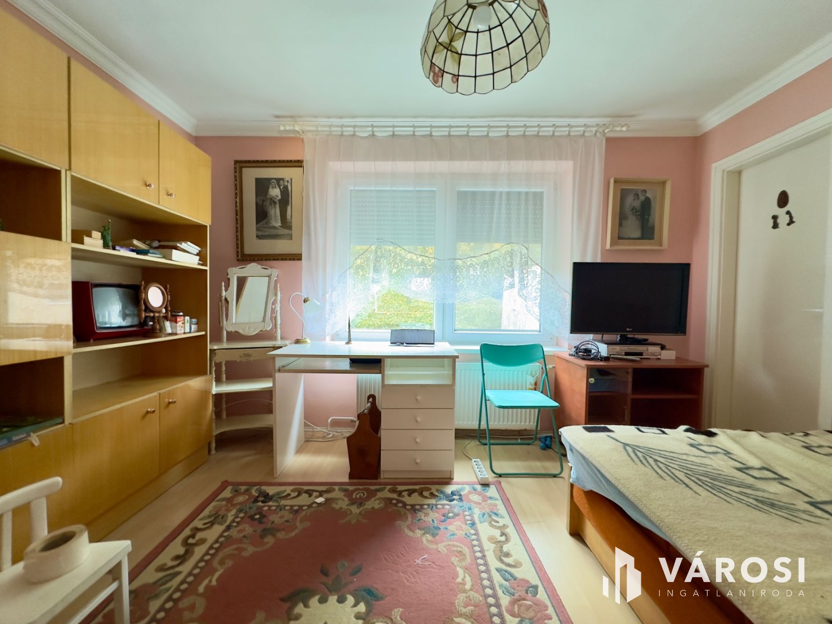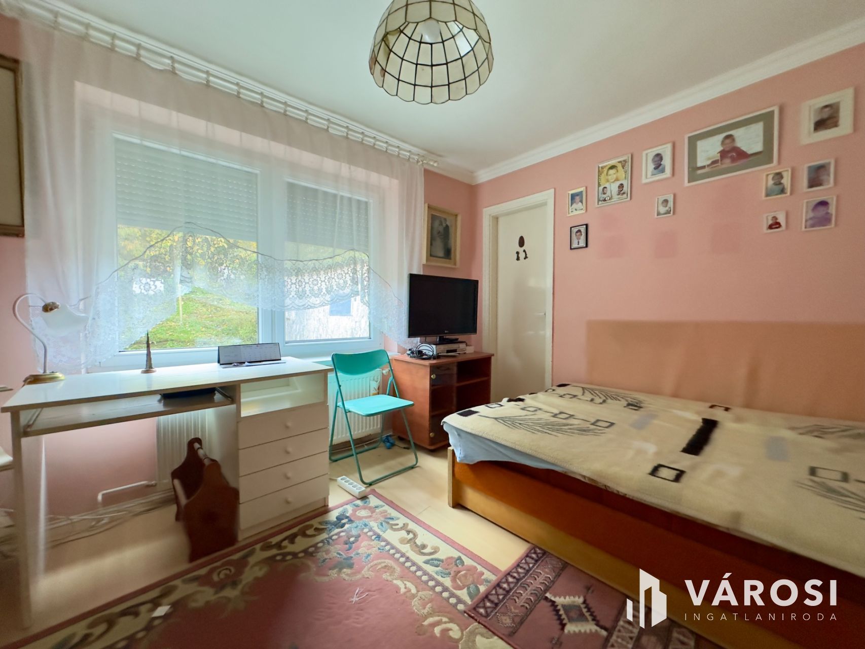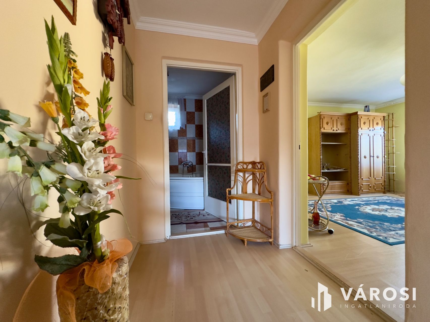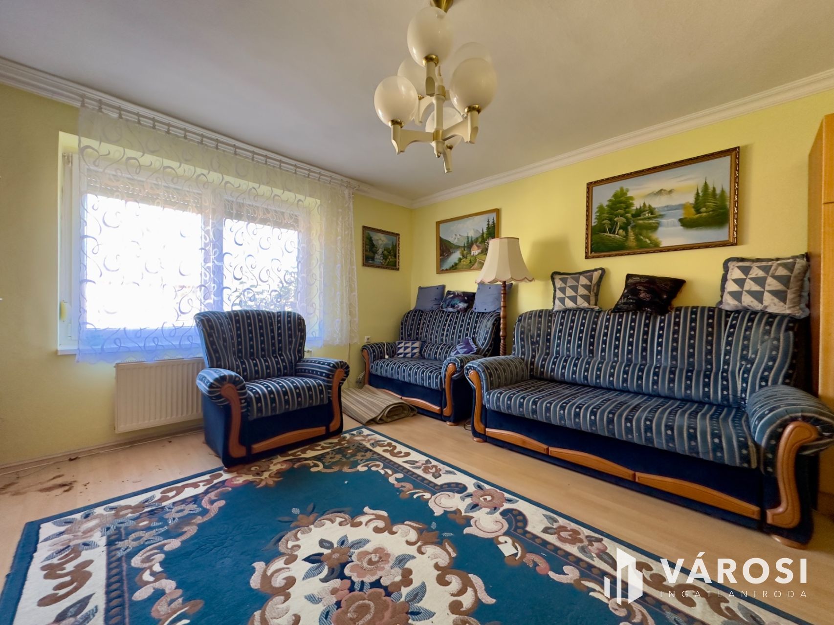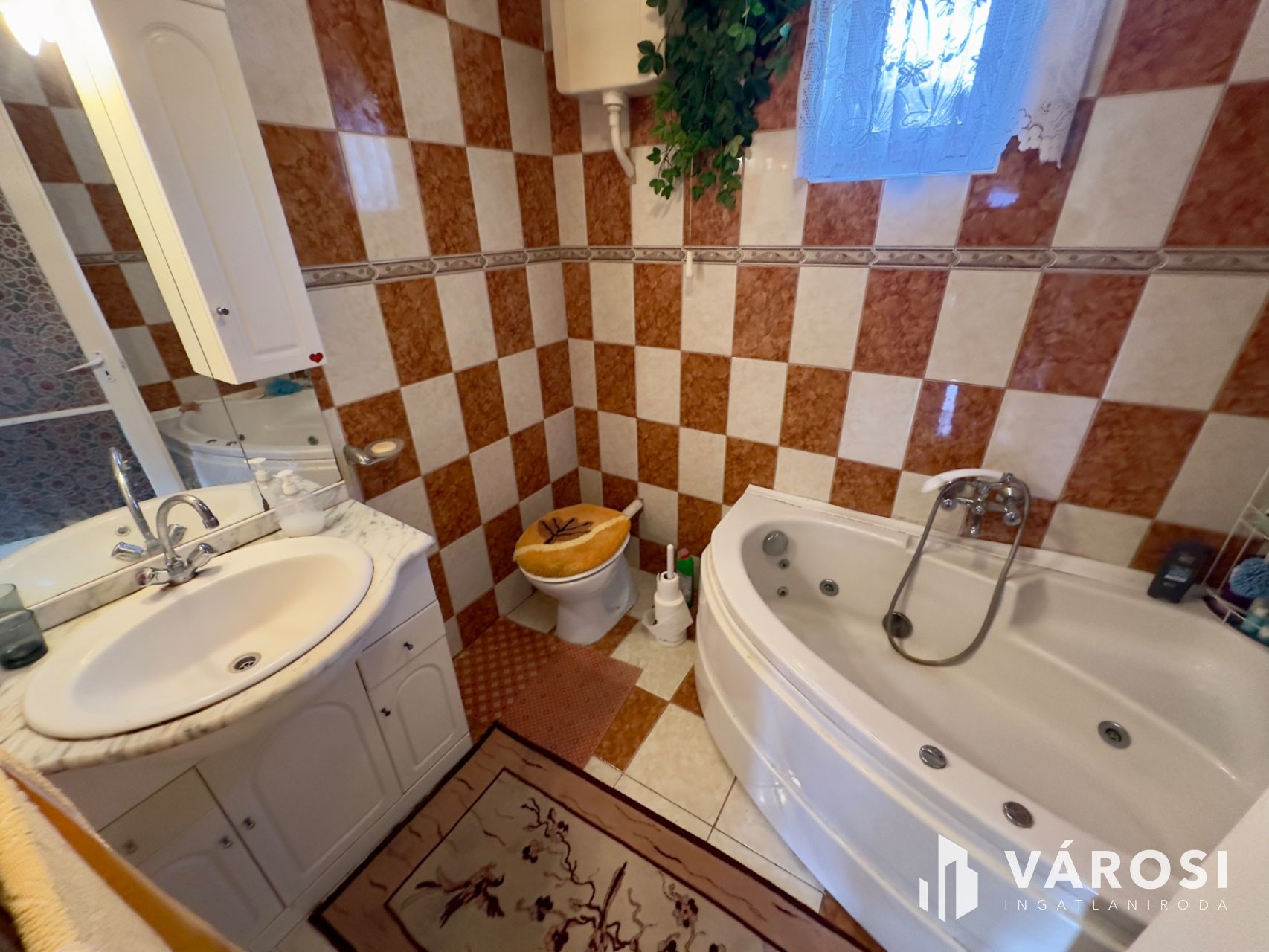 Helyiségei: az alsó szinten konyha, étkező, kamra, külön nyíló W.C., közlekedő, kazánház, garázs (elektromos kapuval), a felső szinten 4 szoba, közlekedő, 2 fürdőszoba.