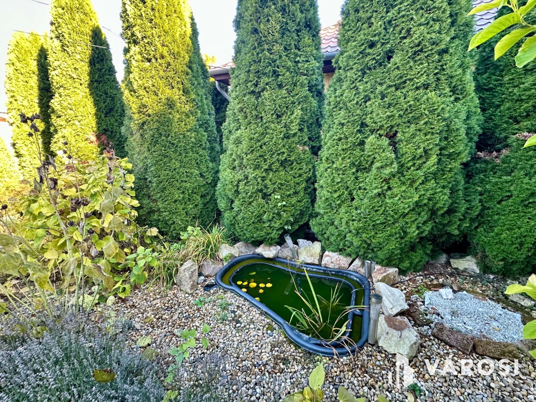 Az épület mellett parkosított zöldterület, kerti tó, valamint, aszfaltozott, felszíni gépkocsibeálló került kialakításra.
