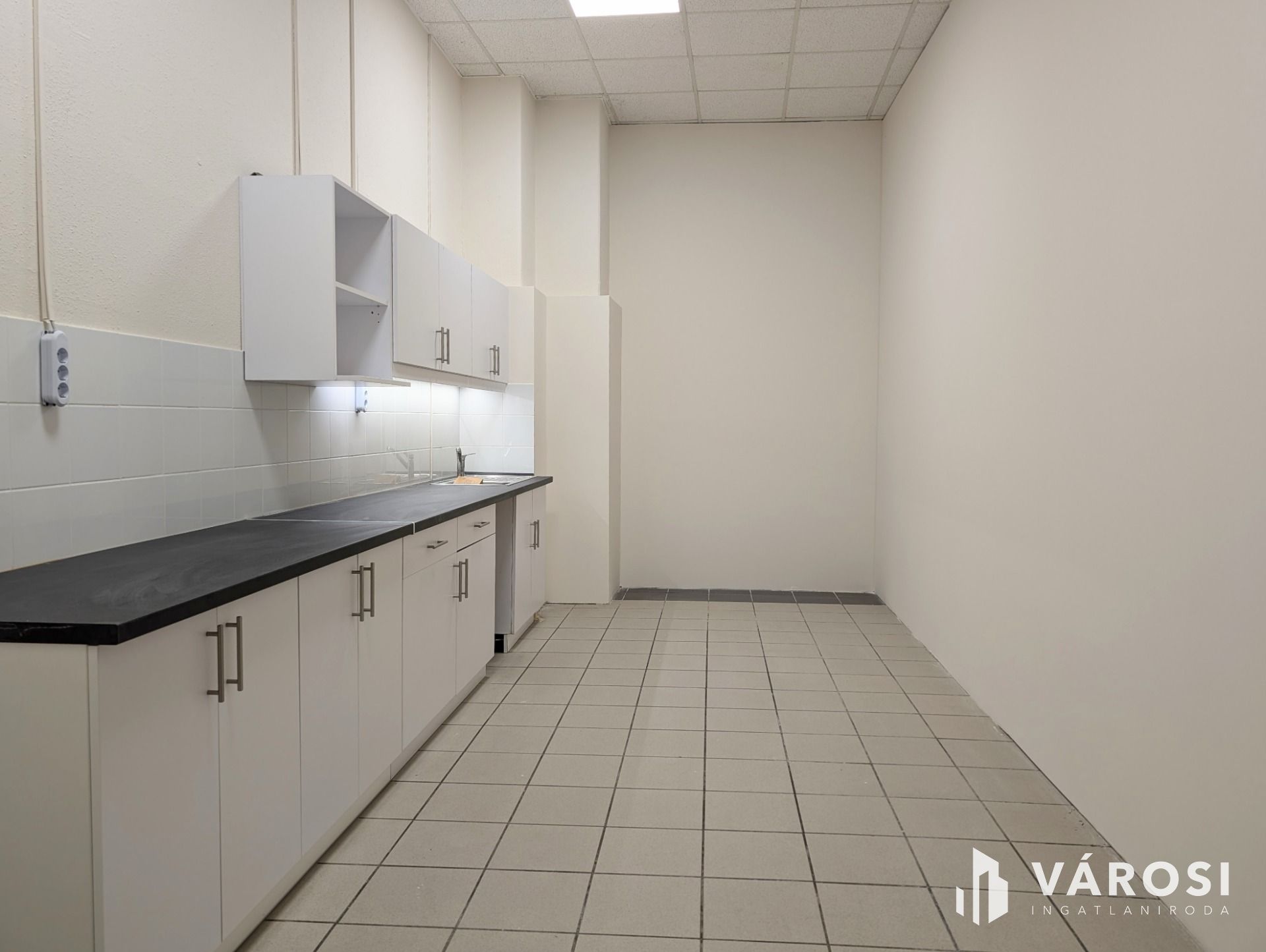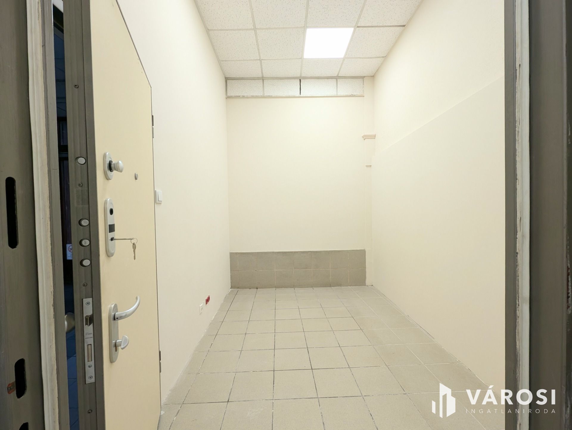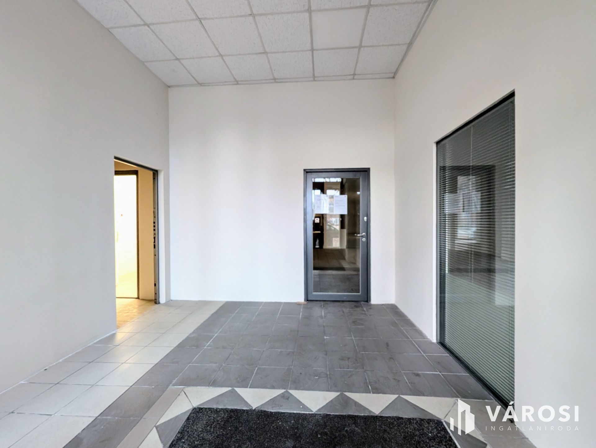 A kerámiaburkolattal ellátott alsó szinten található a részben tagolt nagy tér, 2 vizesblokk, egy teakonyha az egyéb kisebb helyiségek mellett. Utcáról megközelíthető, teljes üvegportállal rendelkezik.