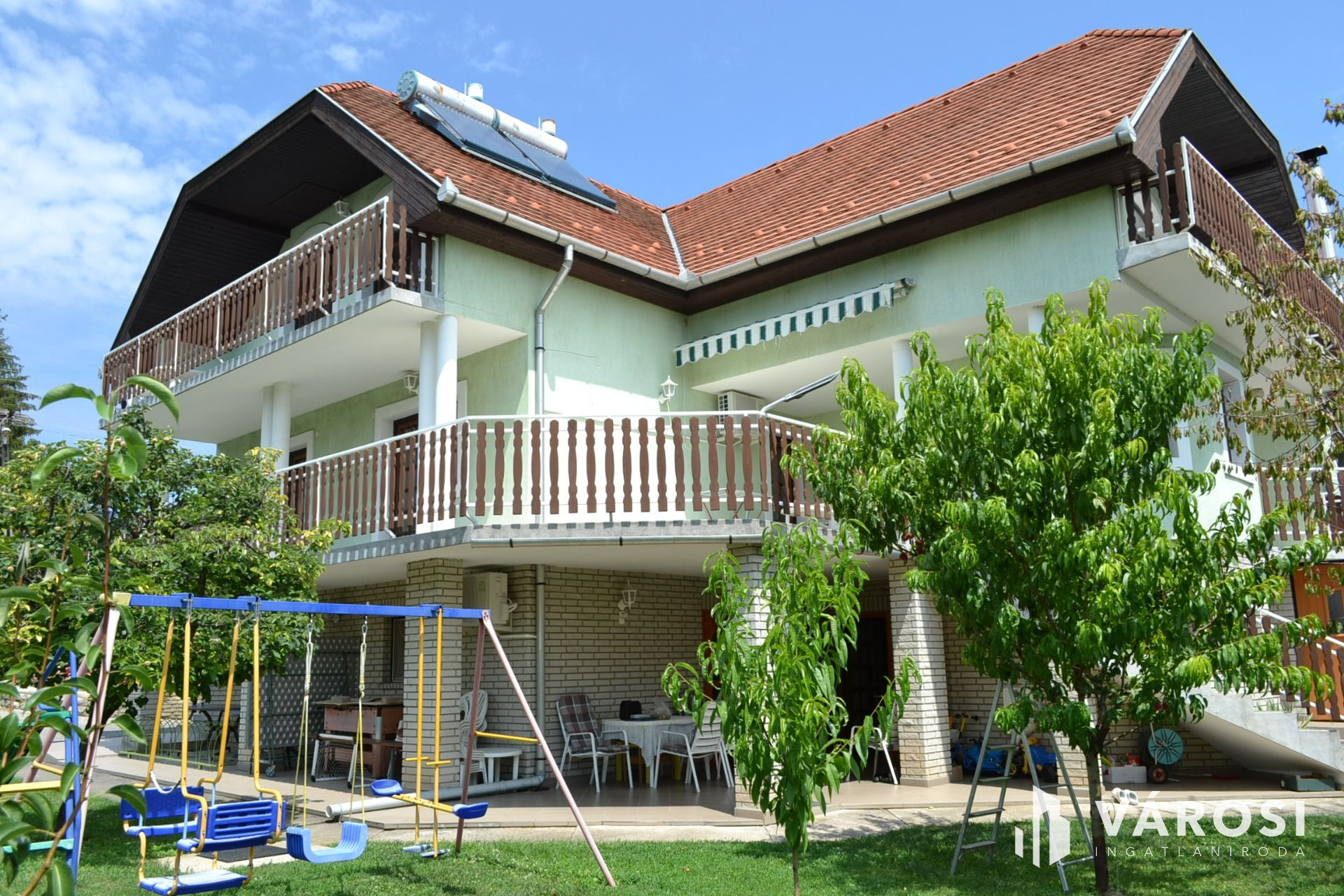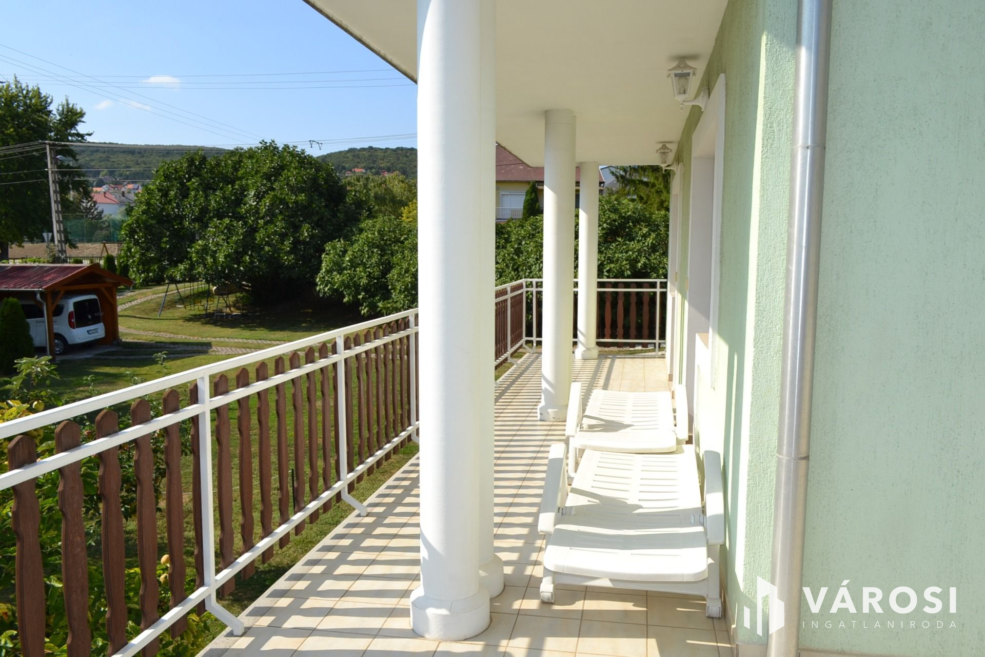 -az emeleten pedig : szintén külön bejárattal, konyha-étkező és 4 szoba, fürdőszoba, konyha, kamra és ugyancsak  nagy méretű erkély található.  (itt láthat egy kis panorámát a Balatonból)