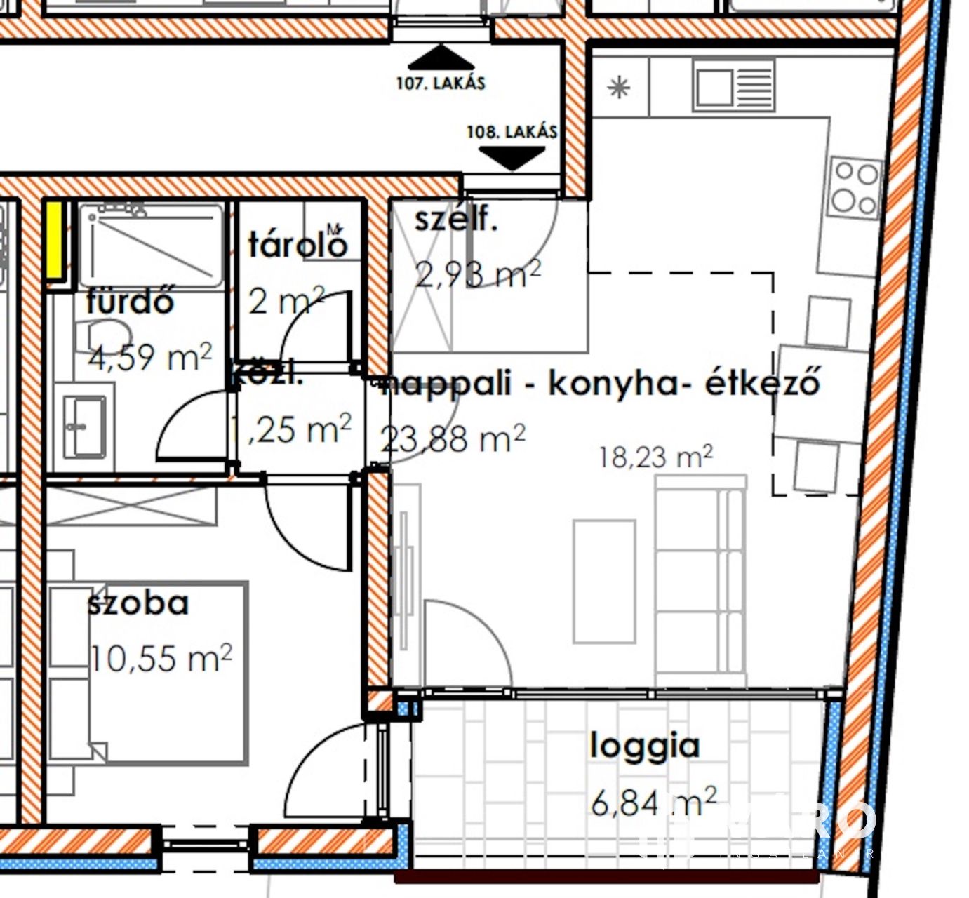 A 1 db amerikai konyhás nappalival, 1db hálószobával, 1 db fürdőszobával, közlekedővel, loggiával rendelkezik.