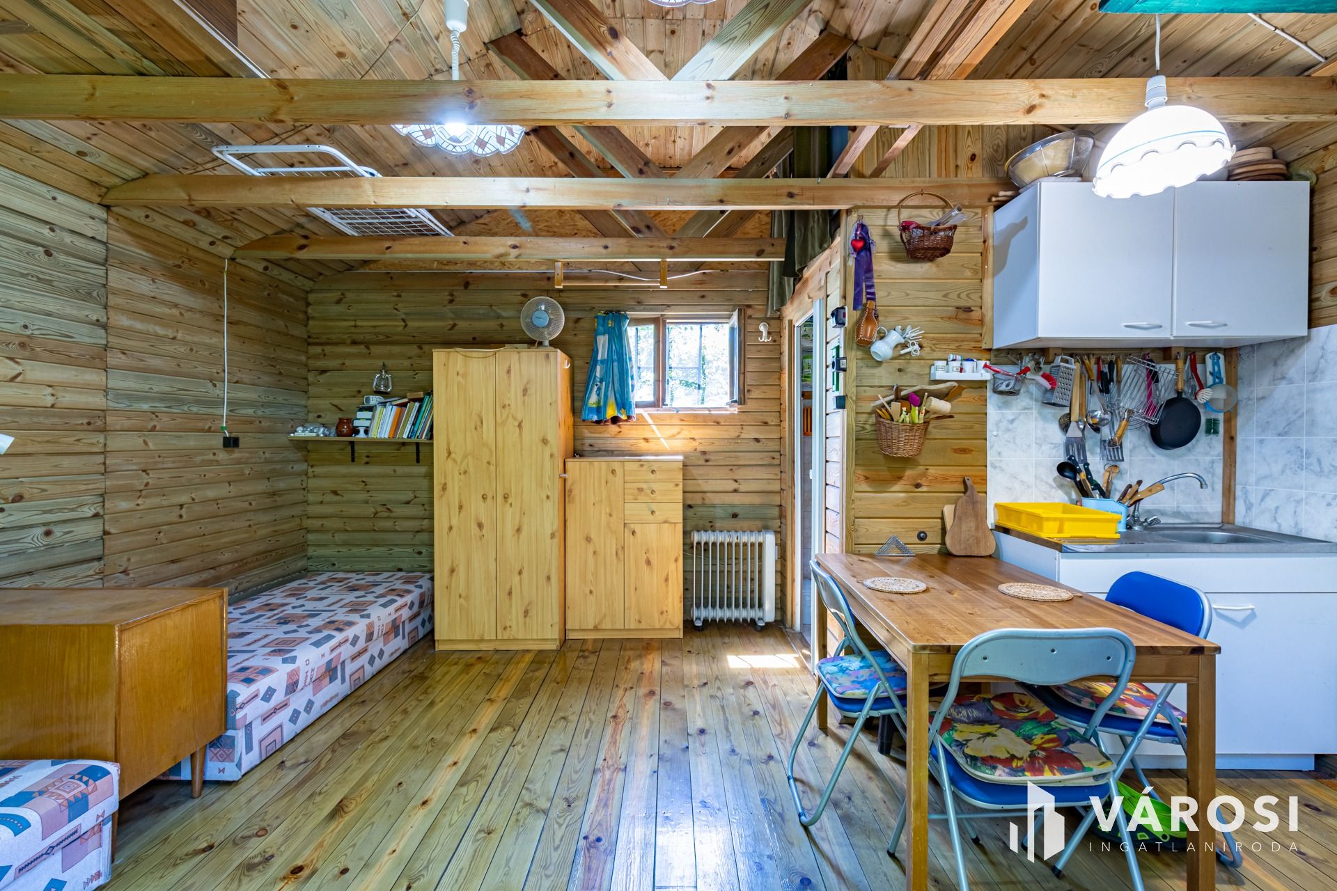 A faház elektromos radiátorral jelenleg is fűthető és villanybojler melegíti a vizet.