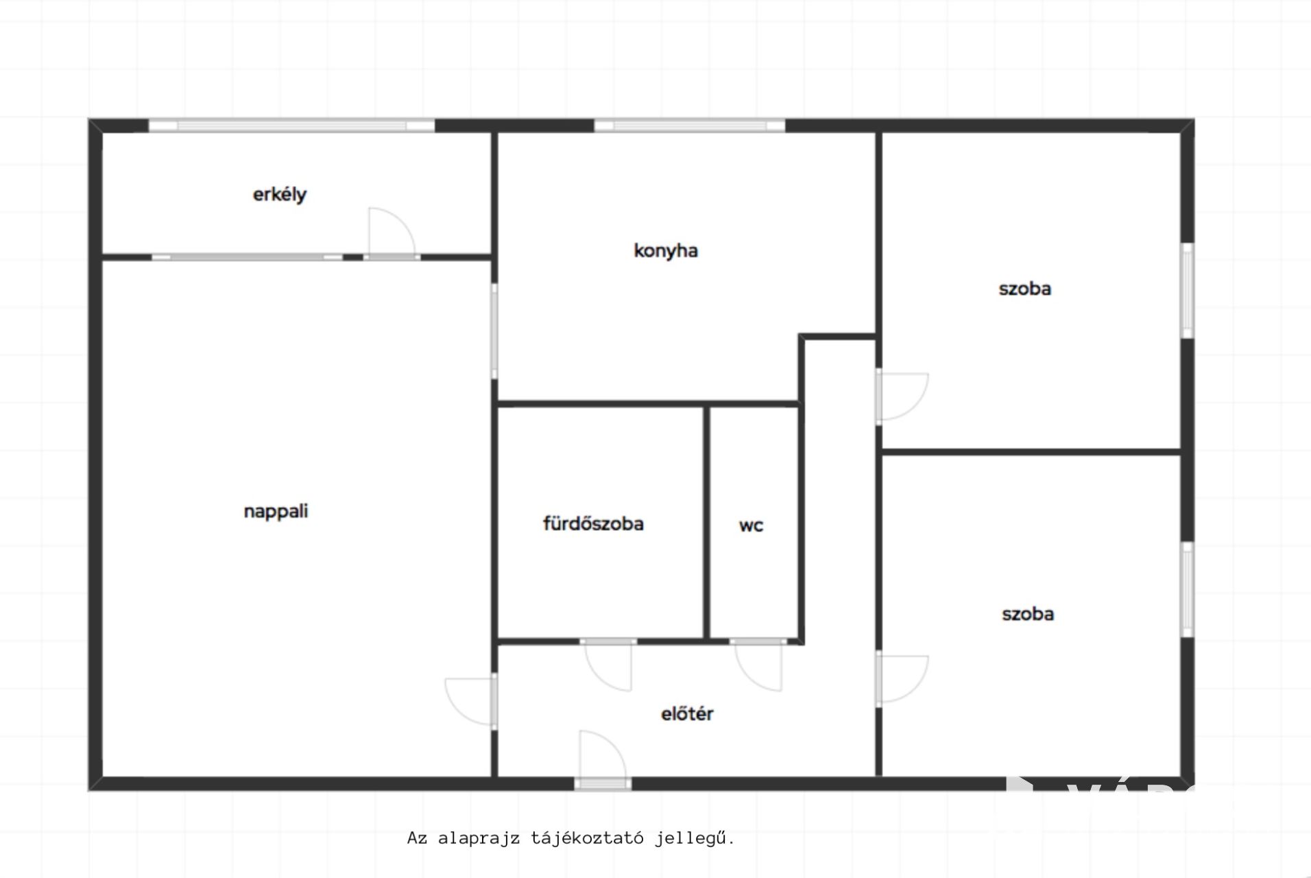 - Elrendezés: nappali, erkély, 2 külön bejáratú szoba, , közlekedő, fürdőés wc külön helyiségben, konyha
