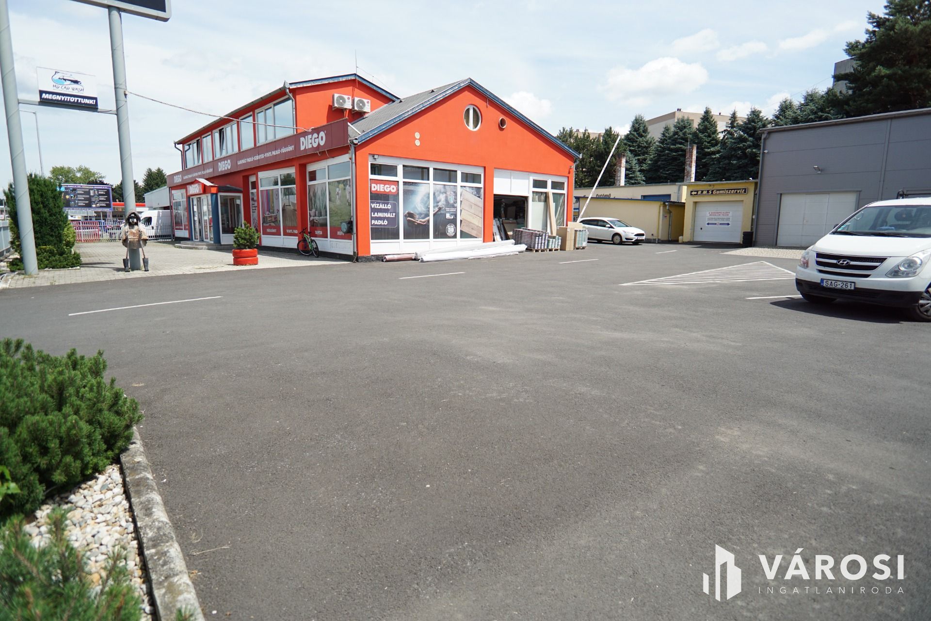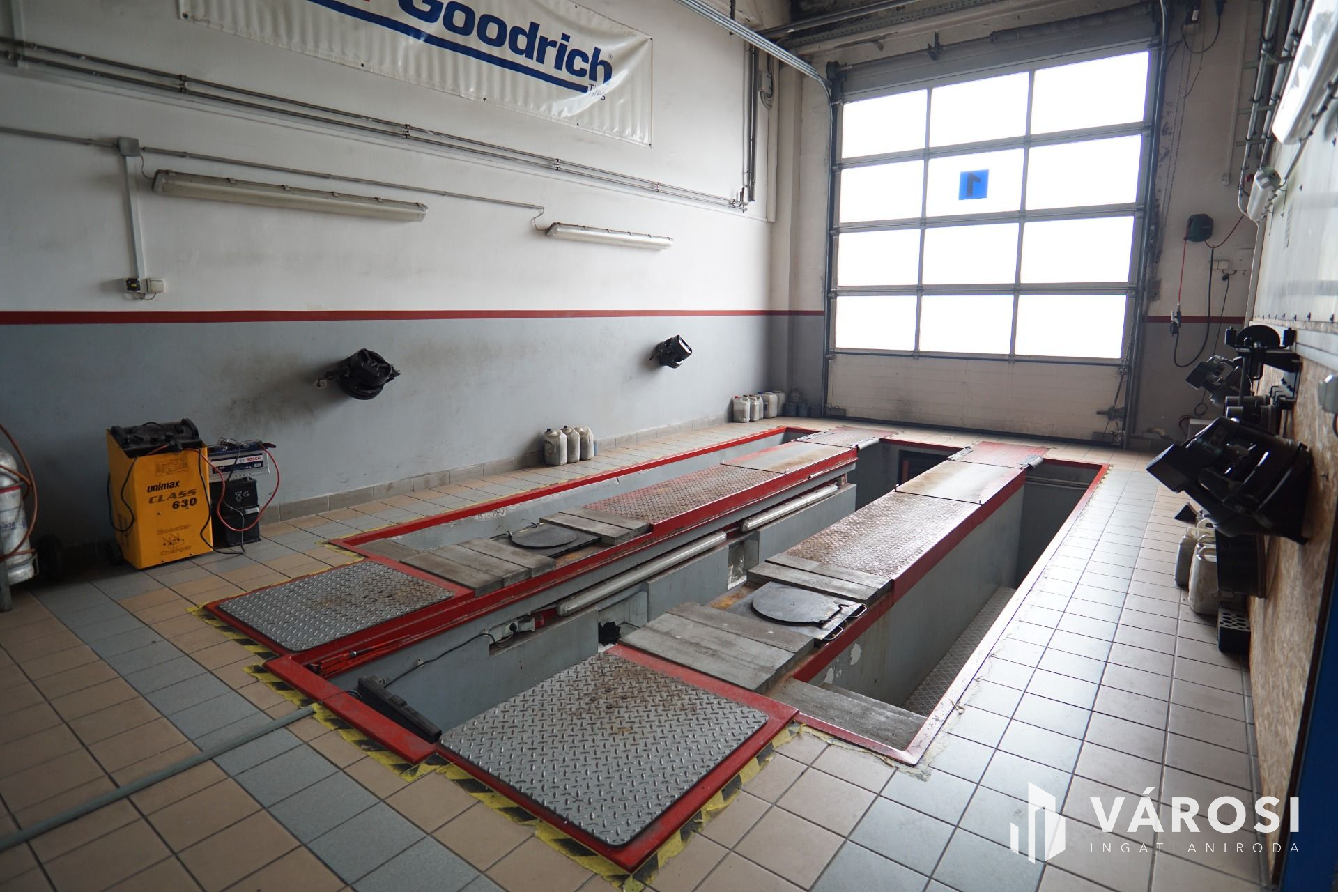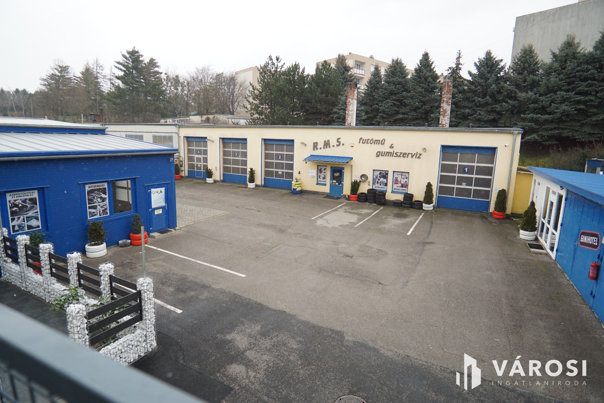 Szerviz: 4 külön beállóval rendelkező tégla épület, belső irodával, tárolóval, alkatrészmosóval, galériával valamint forgácsoló-javítórésszel. (Tulajdonos által használva).