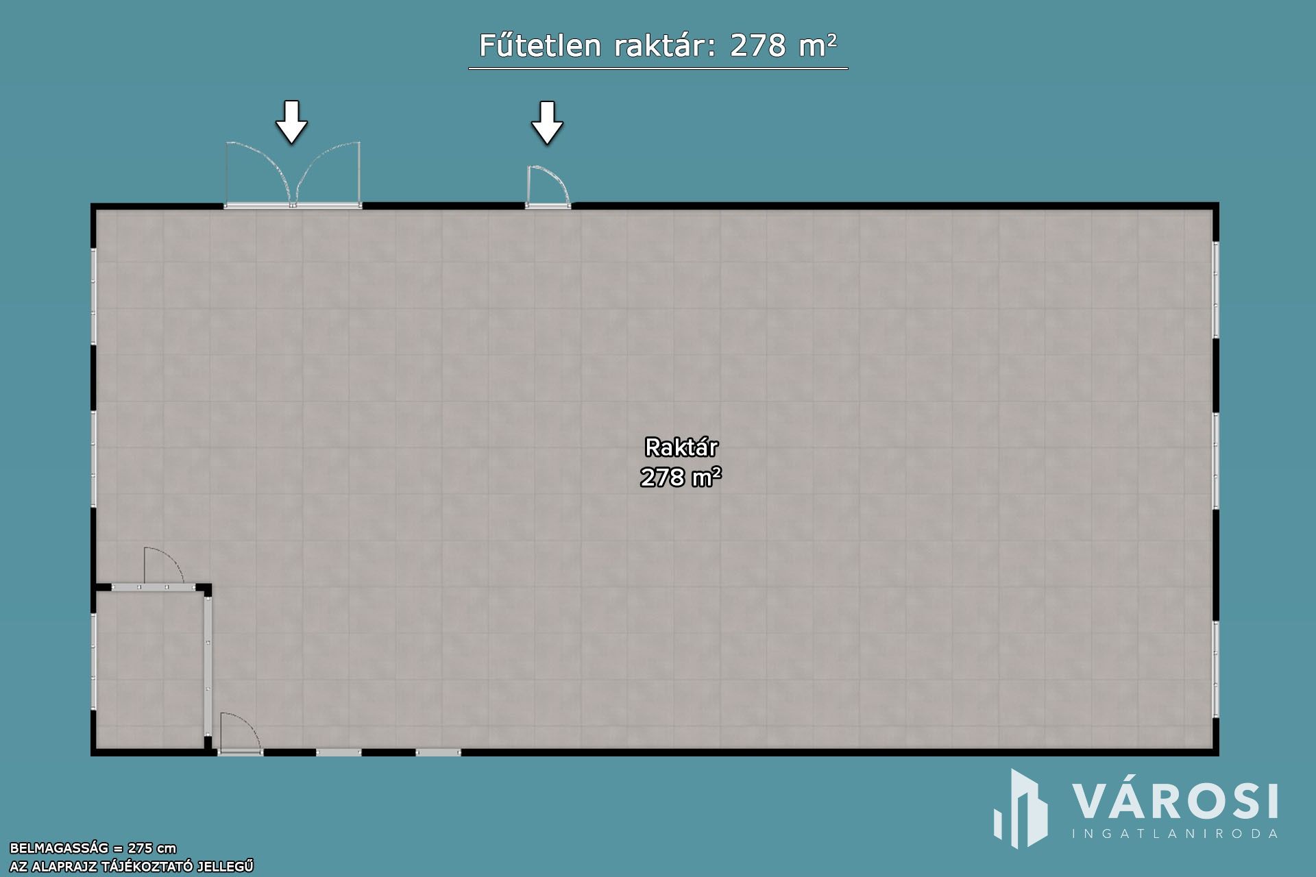 A raktár belső mérete: 11,6 X 24 méter. A belmagasság: 275 cm.