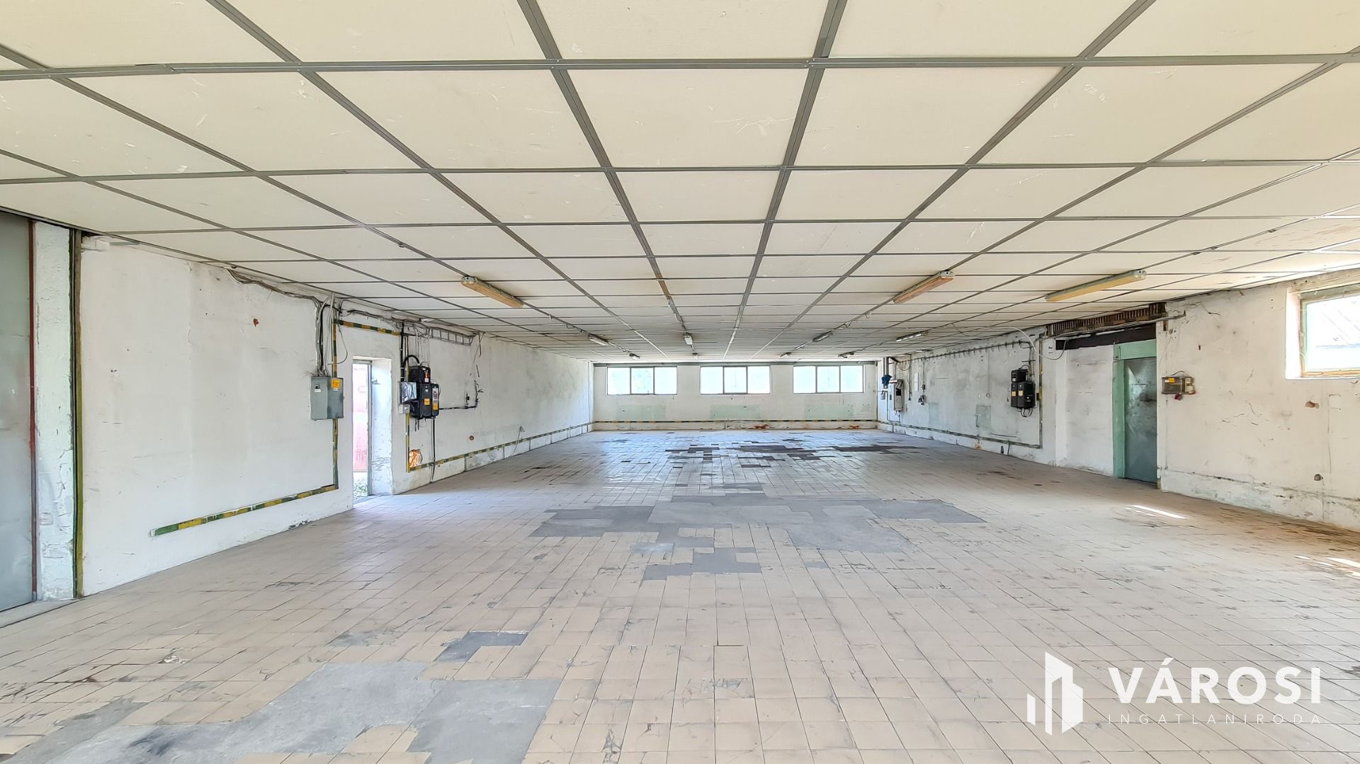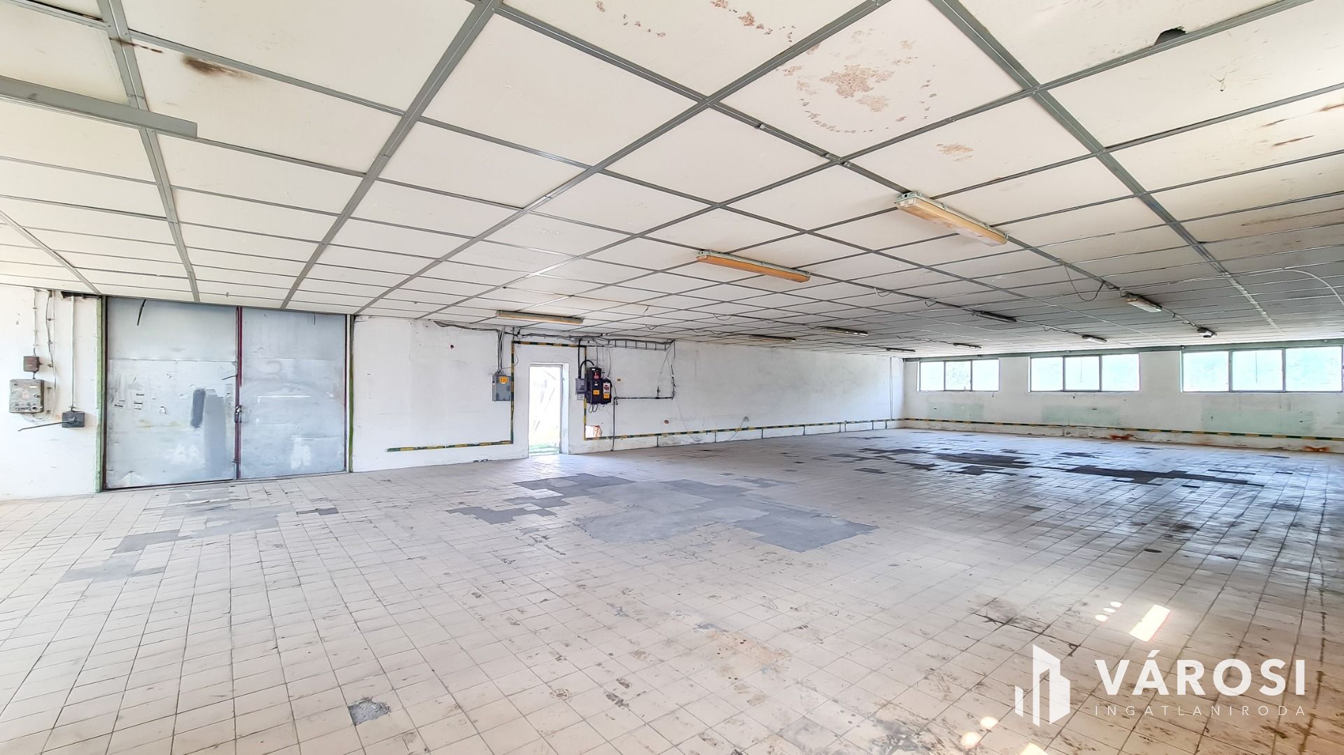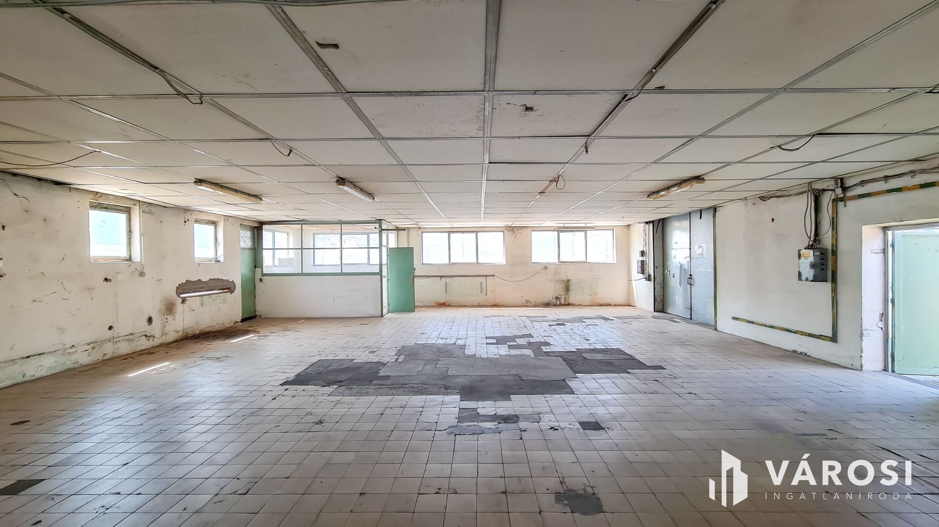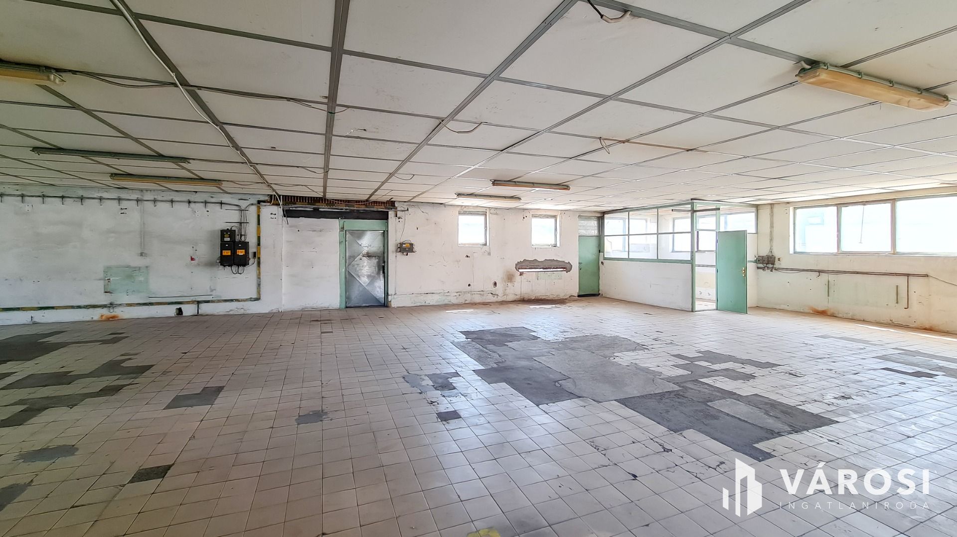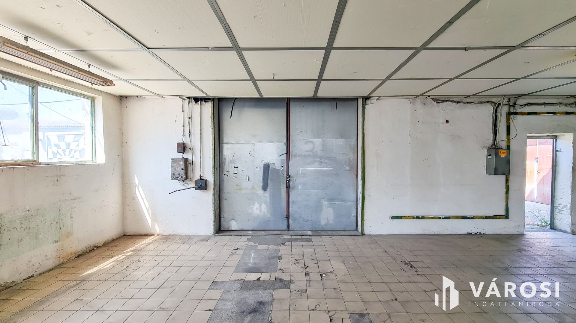 Beton és járólap burkolat épületen belül, 3X50 Amper ipari áram és vízóra van (csatorna nincsen).
