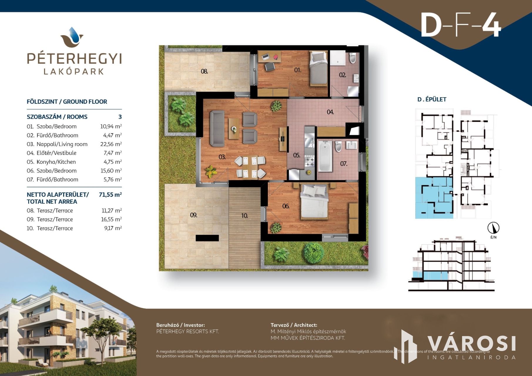 Alapterülete 71,55 m2 + 37 m2 terasz.
