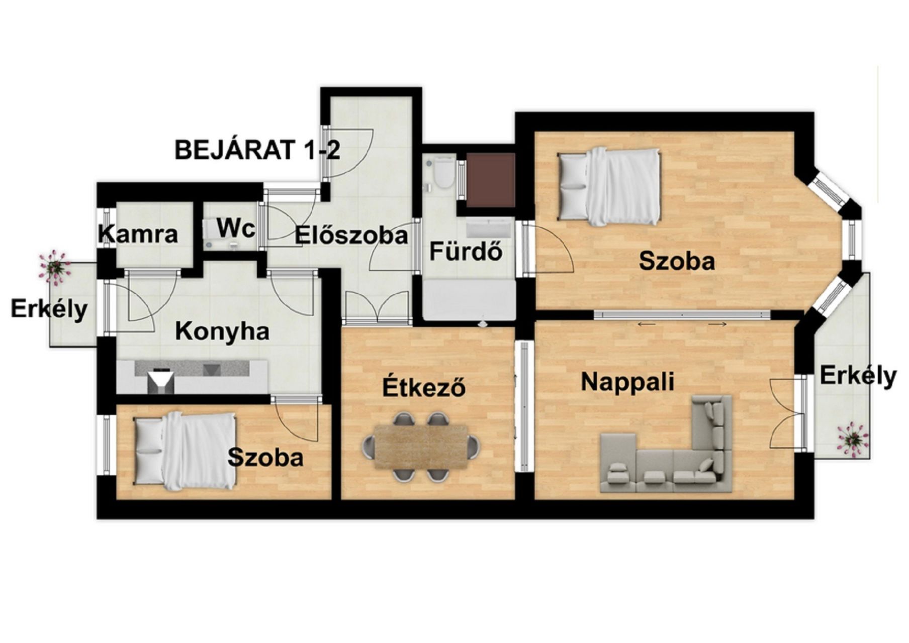 -84nm-es lakás(konyha, nappali, 2 lakószoba, fürdőszoba, előszoba, különálló wc és egy kamra)