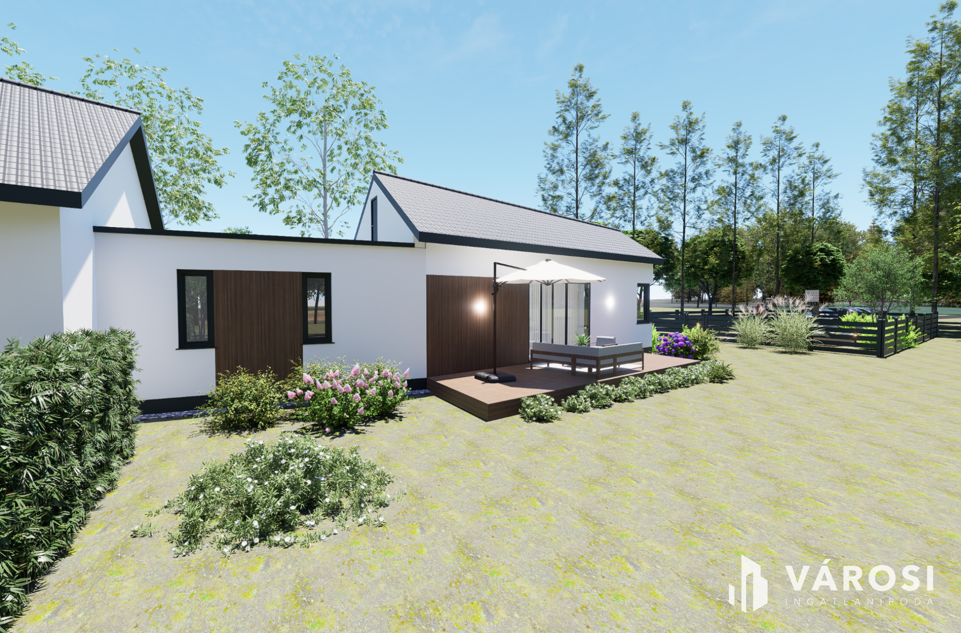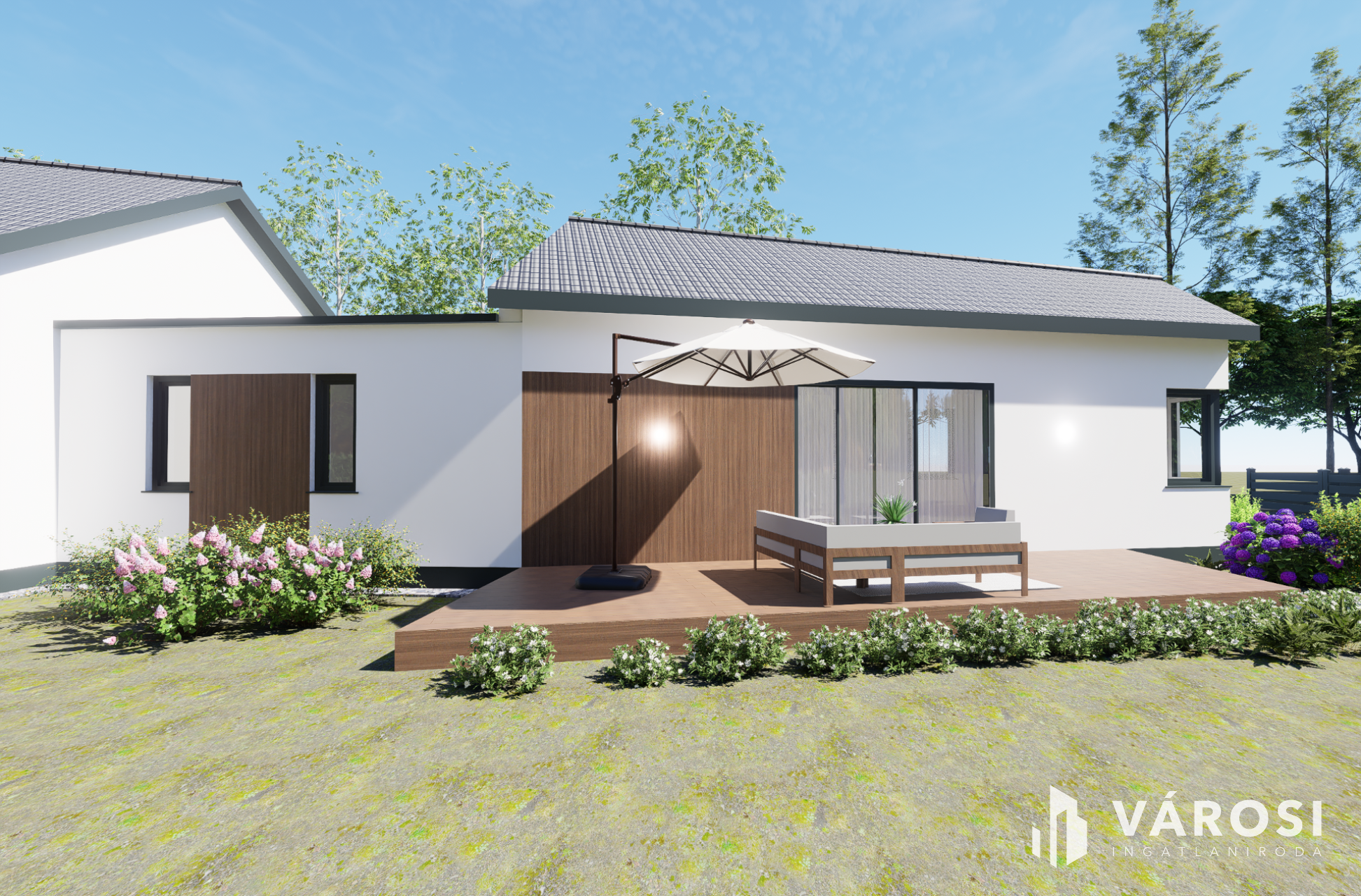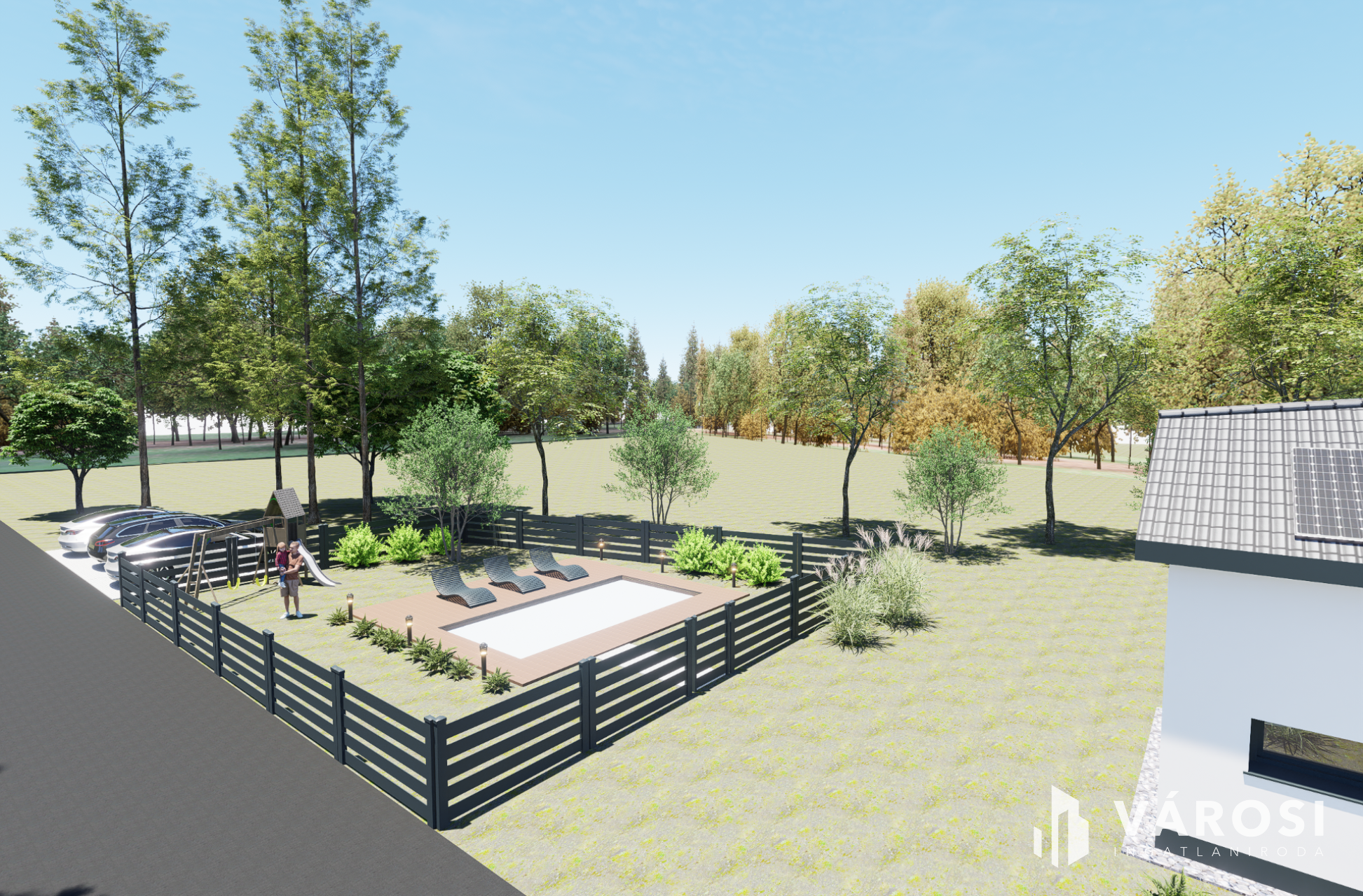 - ~100 m2 privát, csak a tulajdonosok számára elérhető, medence és napozó-játszó tér