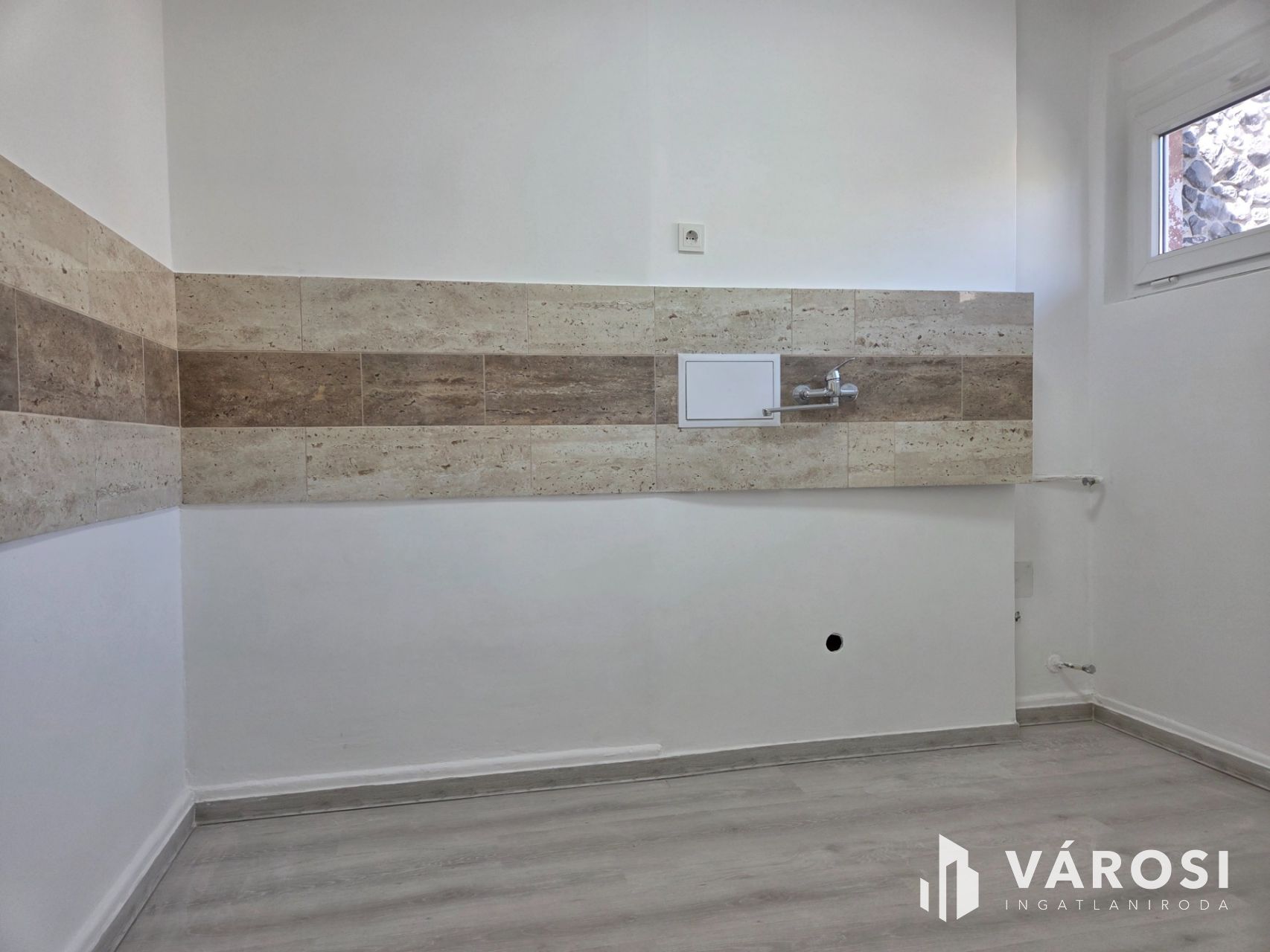 A mosókonyhában a mosógépnek a víz és szennyvízcsatlakozás kiépítésre került.